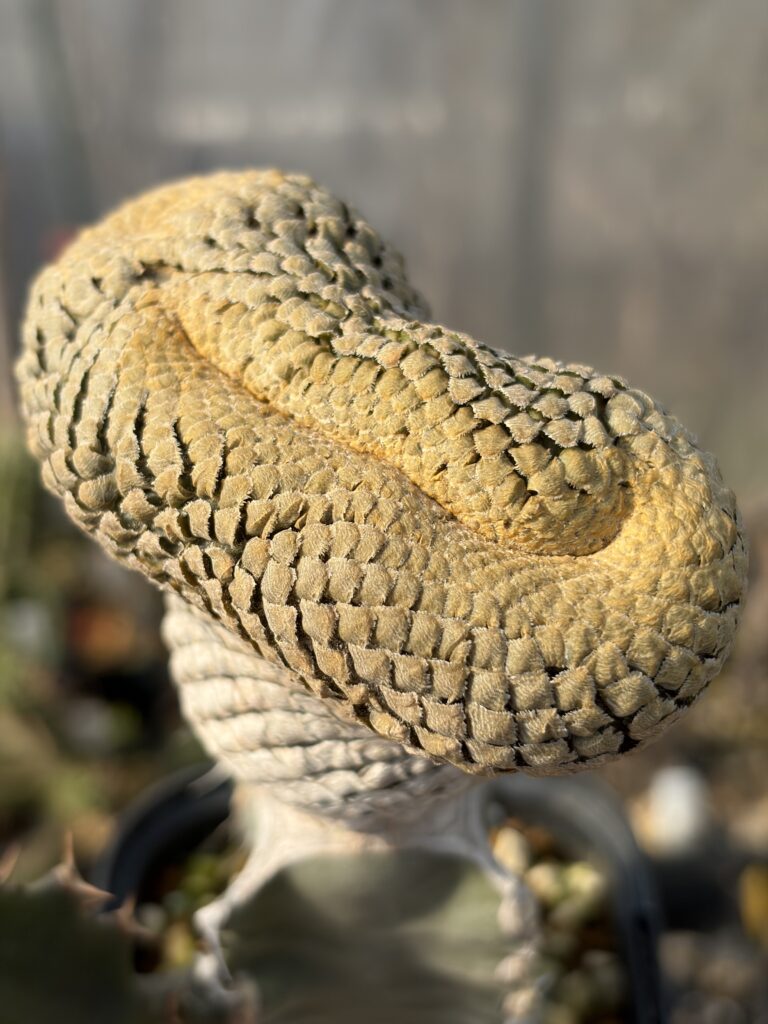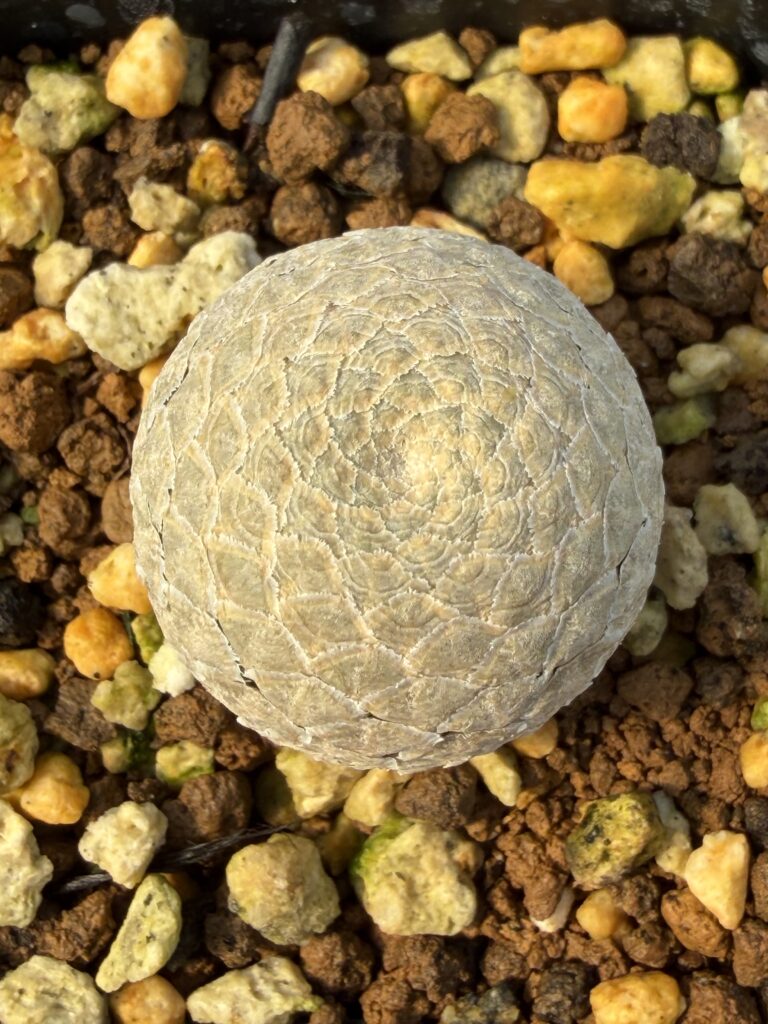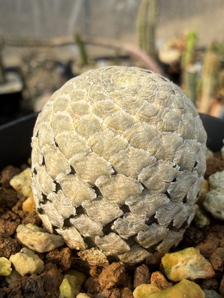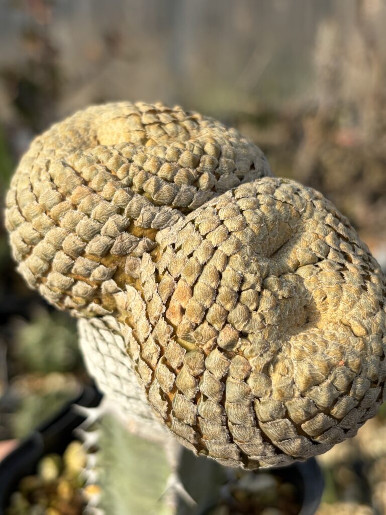 これは葉痕が変化した結節が平坦な鱗片状となり、螺旋状に重なり合ったものです。このような構造はユーフォルビア属の中でも本種のみに見られる、極めて特異な形質であり、他種と混同されることはほとんどありません。